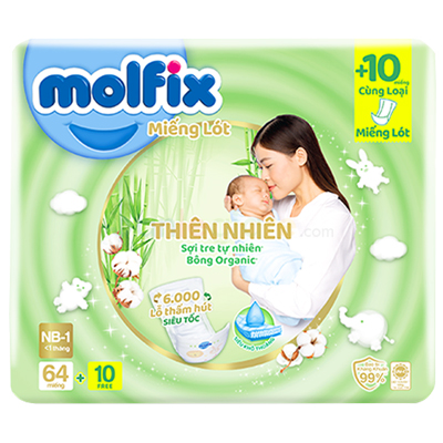 Miếng lót sơ sinh Molfix Thiên nhiên Jumbo Newborn 1 (dưới 1 tháng tuổi) - Gói 64+10 miếng