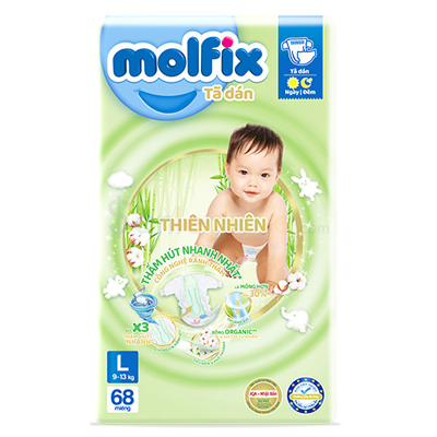 Tã/bỉm dán Molfix Thiên nhiên Super Jumbo L (9kg - 13kg) - Gói 68 miếng